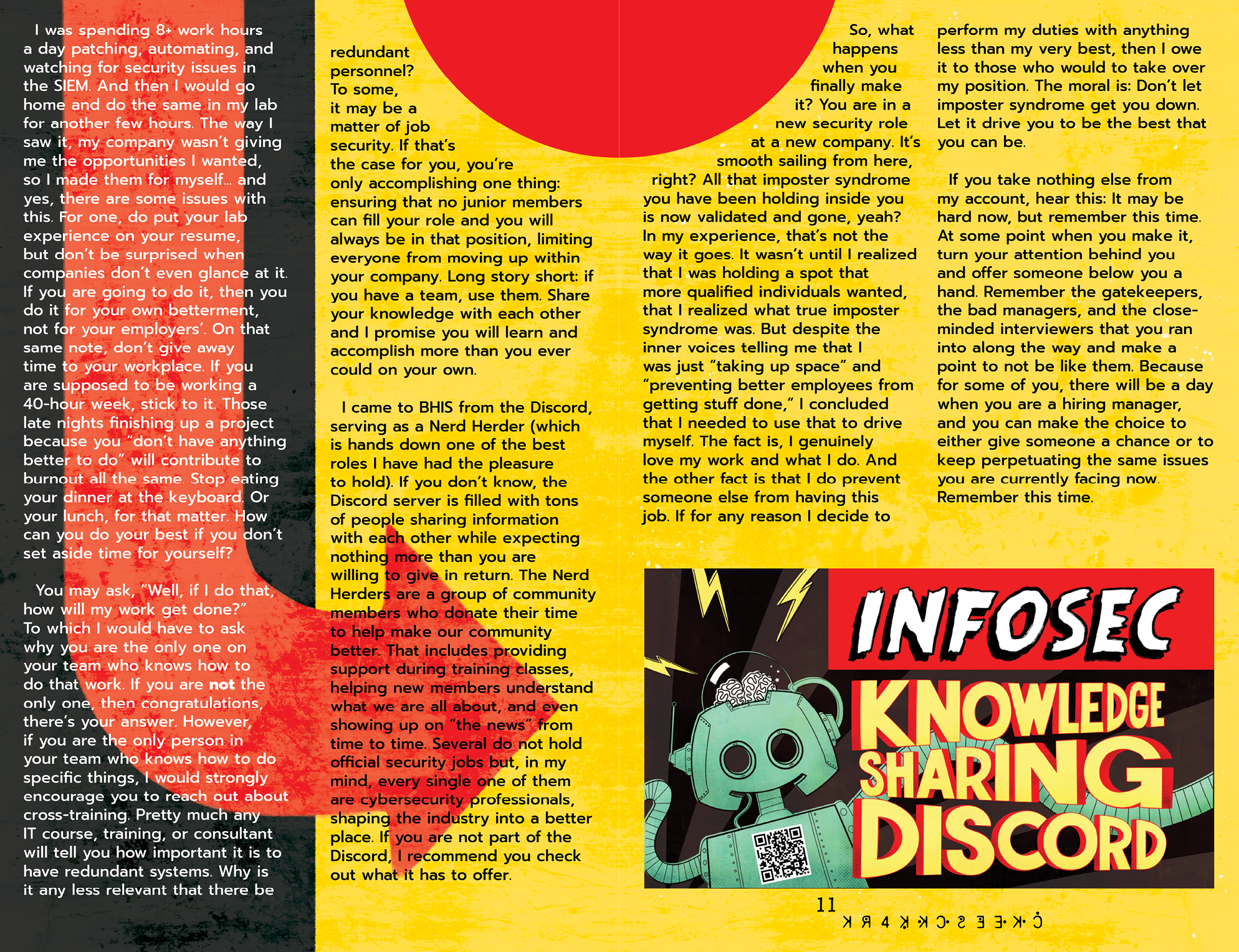 Life doesn’t always go according to plan. We do our best to set fair deadlines and respect reasonable working hours… but due to an unfortunate series of uncontrollable life events, the team was left with just 2 weeks to get the zine from plain-text articles to designed and ready-for-print if we wanted this issue to be ready to share at the 2022 Wild West Hackin’ Fest. So our designer squeezed more than a month of hours into those two weeks, and the whole team learned a lot about how to streamline the process of production… but the biggest lesson? Don’t do that again!