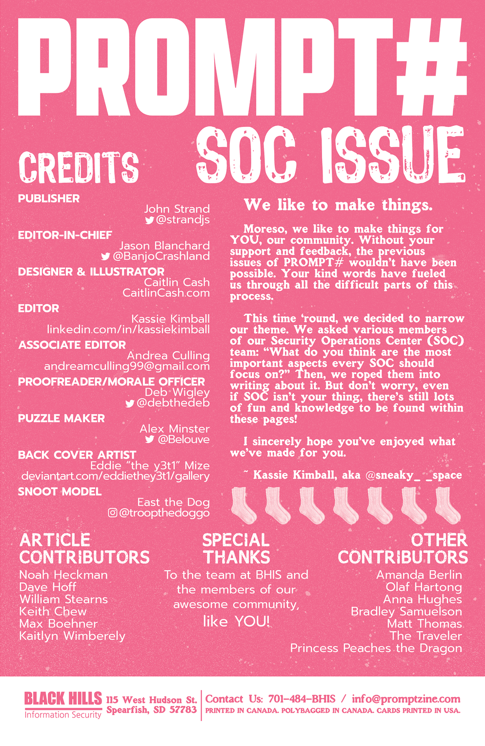 We wanted this issue to be a celebration of the Active SOC Team at Black Hills Information Security! This issue is written by members of the BHIS SOC, and offers a look into what it takes to work as a SOC team member.