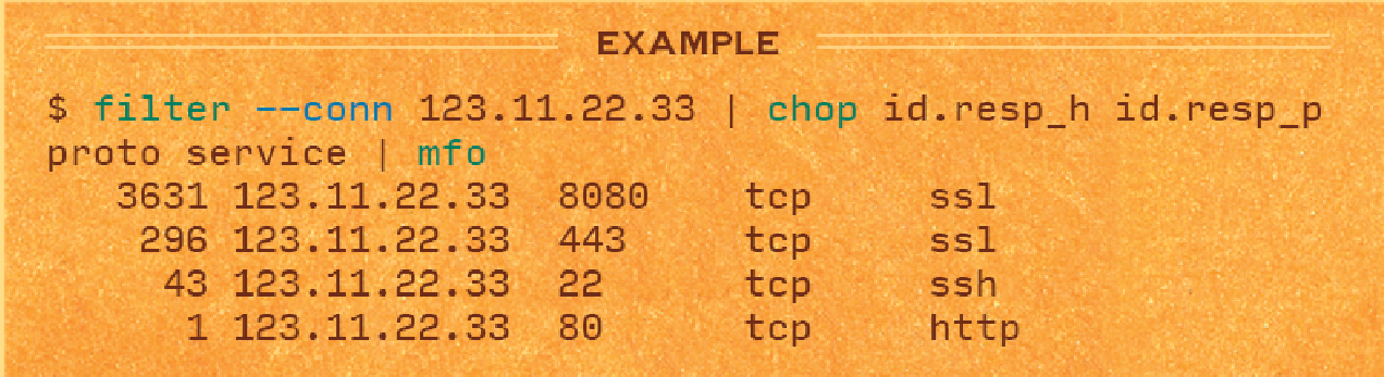 filter --conn $IP | chop id.resp_h id.resp_p proto service | filter $IP | mfo