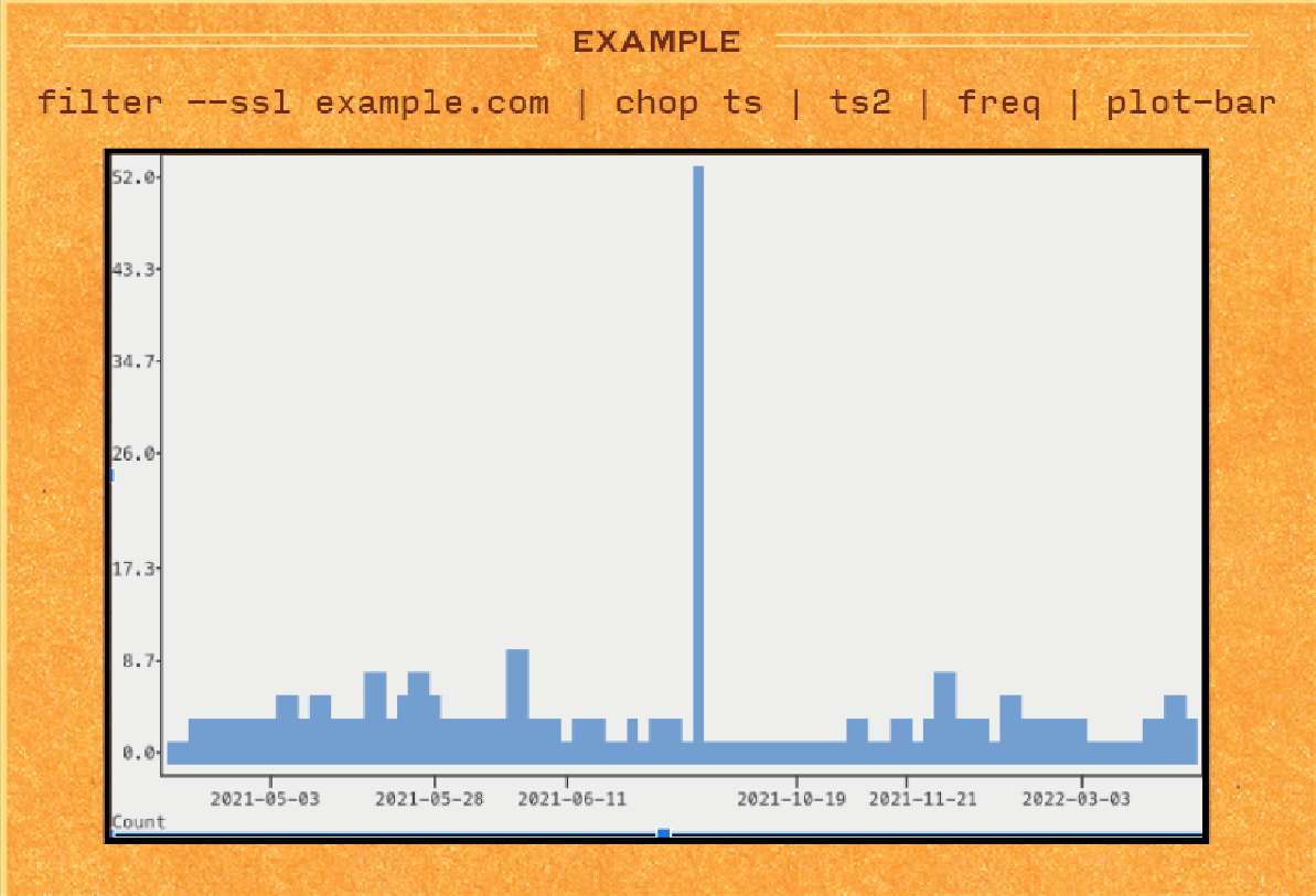 filter --ssl $DOMAIN | chop ts | ts2 | freq | plot-bar