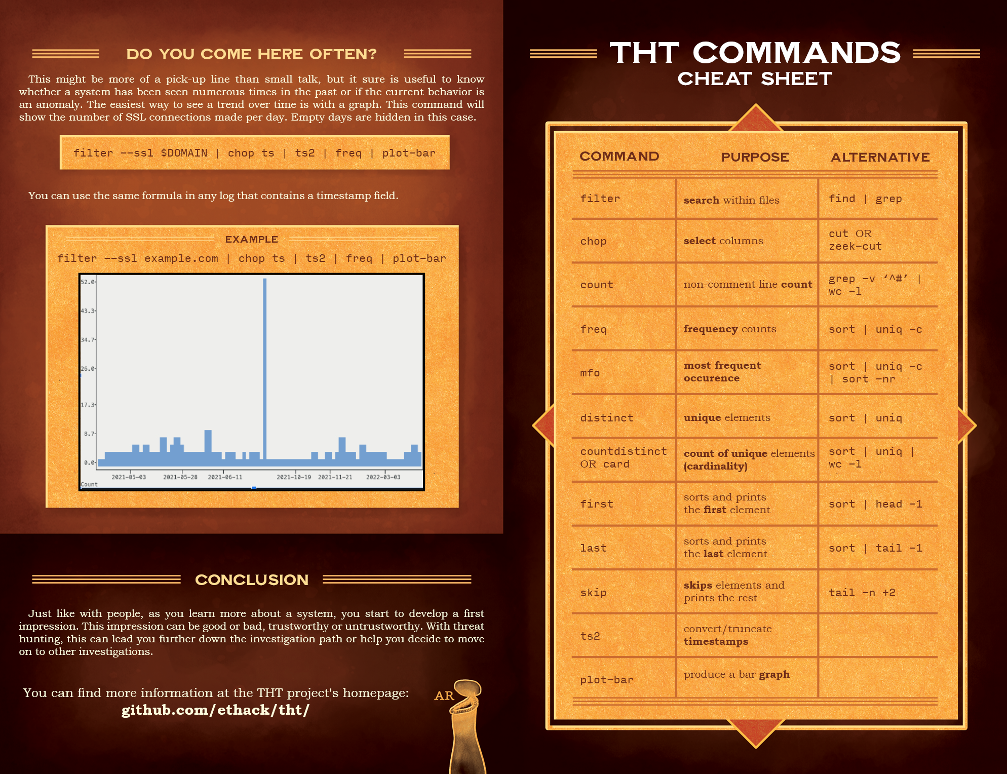 You can think of the Threat Hunting Toolkit (THT) as a command line environment containing a curated selection of data-processing utilities you can take with you anywhere, much like a craftsman’s toolkit. While THT is designed with processing Zeek network logs in mind (both TSV and JSON), we’ve also used it successfully with other delimited logs, such as comma or whitespace separated.